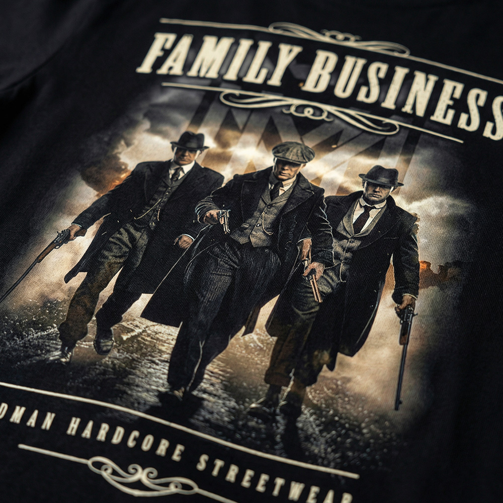 Na plecach pełnowymiarowa grafika w gangsterskim, oldschoolowym klimacie – trzech ludzi idących po swoje. Nad nimi wyraźny napis FAMILY BUSINESS, pod spodem podpis: MADMAN HARDCORE STREETWEAR.